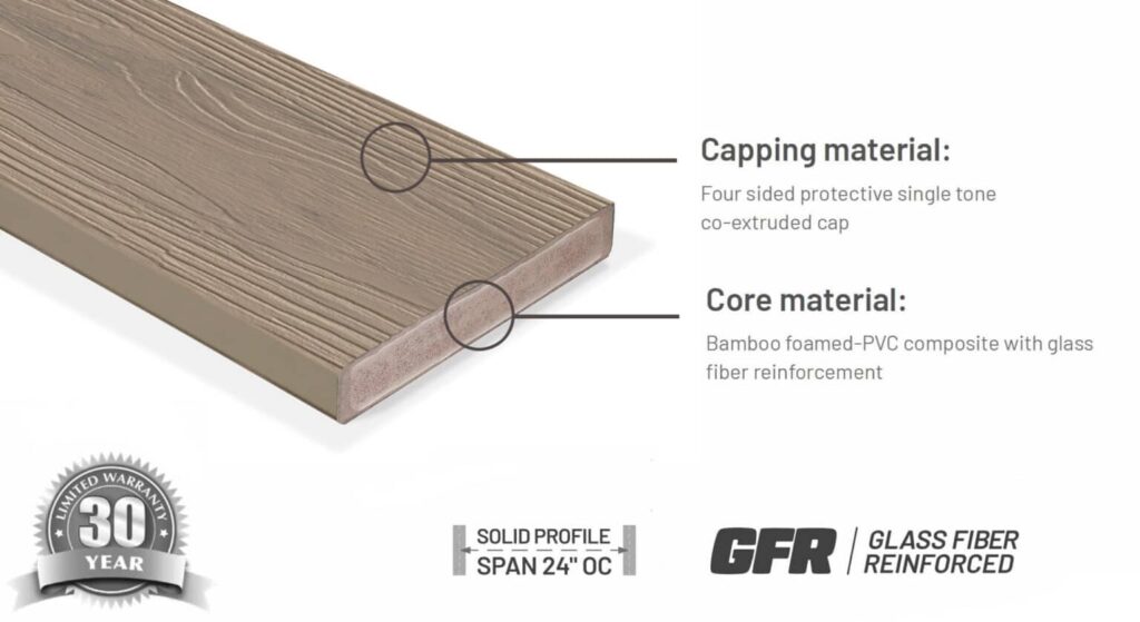 One of Eclipse’s most impressive features is its GFR (glass fiber reinforced) core technology. This reinforcement delivers two significant advantages that set it apart from standard composite decking: